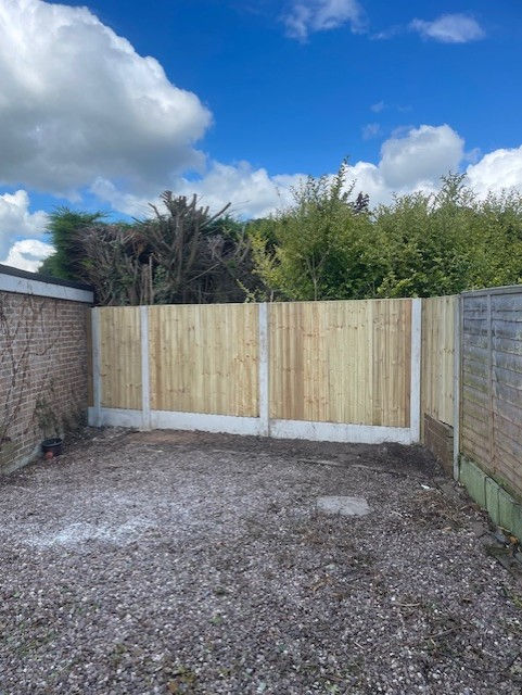 This project showcases the installation of garden drainage with exposed trench and pipe, as well as a gravel yard with new wooden fence and cloudy sky. The images capture the process and result of yard installation and landscaping.